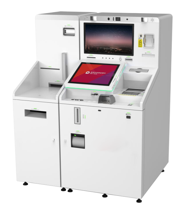 ★产品特点 ●支持对公、对私业务 一款集成对公、对私业务功能的综合化智能设备。 ●操作便携 操作便捷,远程协助。一对一专属服务体验。 ●集成高清视频 集成高清视频、高保真音频采集装置,身临其境的远程视频交互体验。 ●安全性高 客户业务办理过程进行全程录制,保障交易安全性和可追溯性。 | ★产品参数 主板 CPU:Intel 酷睿i系列处理器。 内存:8 G。 硬盘:1T。 2个千兆网卡。 操作屏(电磁电容屏) 19寸电磁电容一体屏(支持10点触摸),支持书写和签名功能。 视频对话屏 21.5寸液晶显示屏。 密码键盘 标准EPP硬加密金属小键盘(16键),支持盲文提示,支持国密算法和DES加密。 读卡器模块 支持电动读取磁条卡读取、IC卡读写功能,符合《中国金融集成电路(IC)卡规范》2.0版本。 磁条读取模块 支持存折和银行卡1、2、3轨磁卡阅读;存折的磁条标准:DIN/ISO、ANSI、ISO7810/7811/7813等。 非接触IC卡读取模块 认证要求:通过PBOC3.0,EMV Level1标准认证。 读卡距离:0-50mm。 吸入式身份证阅读模块 支持二/三代身份证扫描读取。 热敏打印机 纸宽:80mm。 纸卷直径:150mm。 自动切纸,打印速度大于150mm/s。 条码阅读器 支持一维码和二维码扫描功能。 指纹仪 支持普通柜员指纹和公安部指纹。 现金模块 独立双闸门,钞口容量500张,支持连续入钞,出钞口容量200张,支持全面额。 钞箱 具备3个循环箱、1个分隔钞箱、1个废钞\回收箱,单个循环钞箱容量为3400张。 保险柜 保柜符合CCC、UL 291安全标准,有认证证书及公安部检测报告,配置一个机械锁和电子密码锁。 扎把机 适用新旧版人民币0.1-100元面额和各种外币纸币。捆扎张数:100张。 动态密码锁 支持对接行方动态密码锁管理系统,使用双人指纹加短信验证码开锁。 存折补登模块 支持读取存折磁条信息 和 支持打印存折、存单、证书、票据、凭证、证件、单页纸、连续纸。 票据出售模块 具有支票票据文字打印、图像打印(200DPI)和入纸重张检测等功能,支持不同规格格票据入纸。 票据处理模块 支持正反面彩色、灰度、黑白、紫外、红外图像存储箱:票箱带锁,容量200张。 回单打印机 黑白激光打印。打印速度:≥45ppm(A4)。 纸盒数量:≥3个。 单个纸盒容量:≥ 550张。 摄像头 支持人脸摄像头,现场环境全景摄像头,出入钞口摄像头,摄像头角度可调节。 扬声器 支持音量调节功能,最低支持2.0声道。 麦克风 内置式声音收集设备,采集业务操作区域声音信息。 |